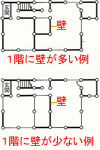 - 瓦など比較的重い屋根葺材であるが、1階に壁が多い。
